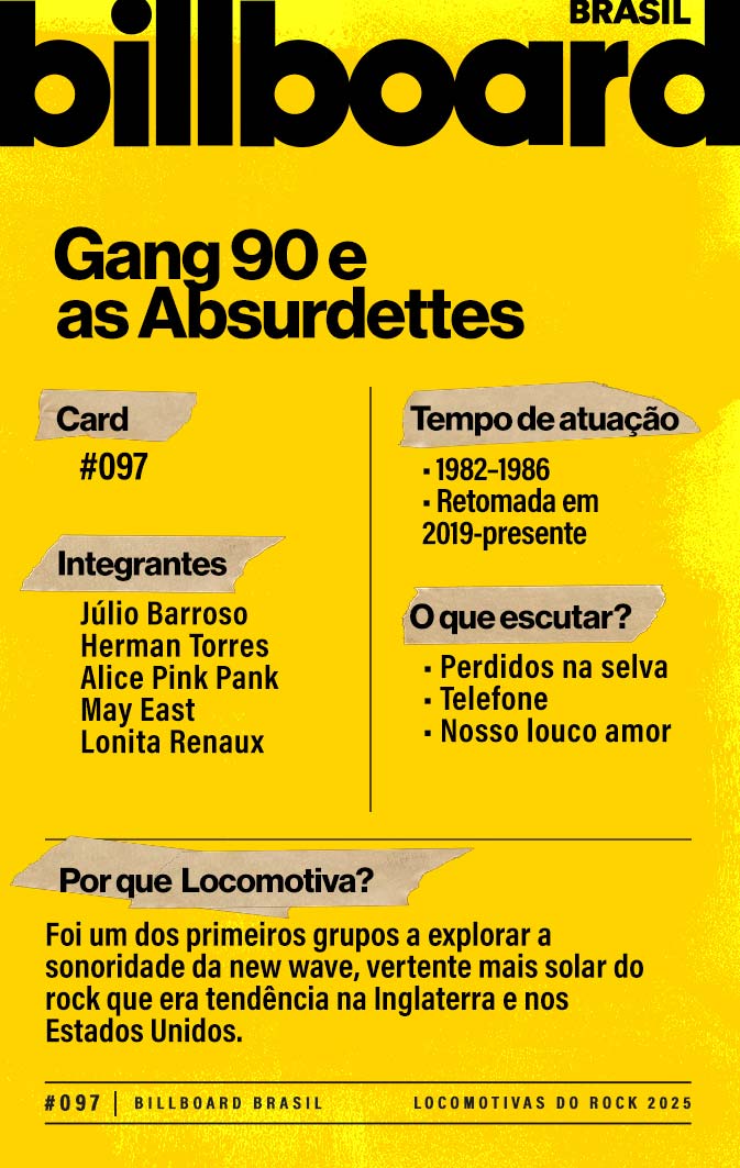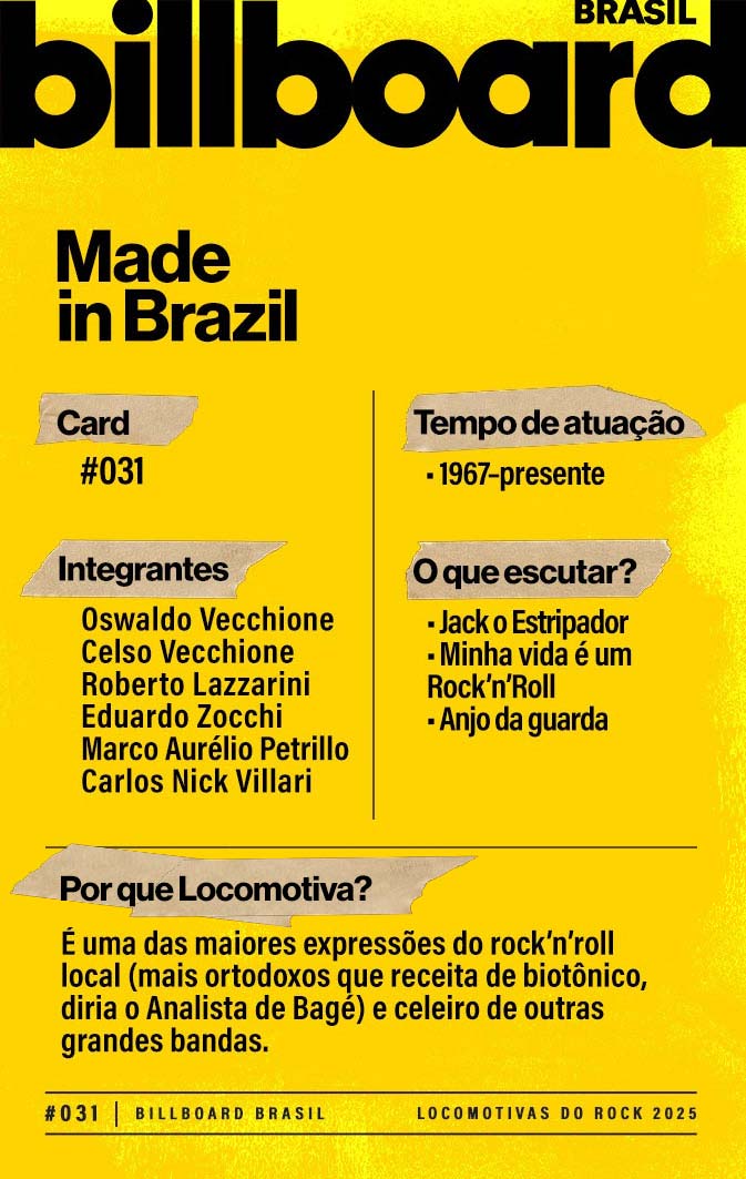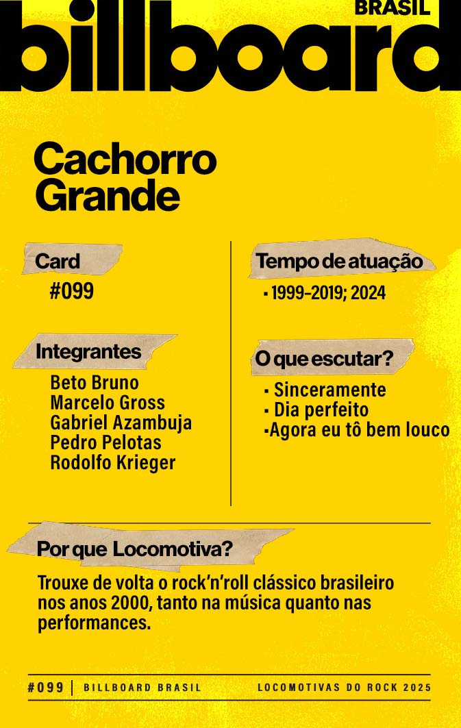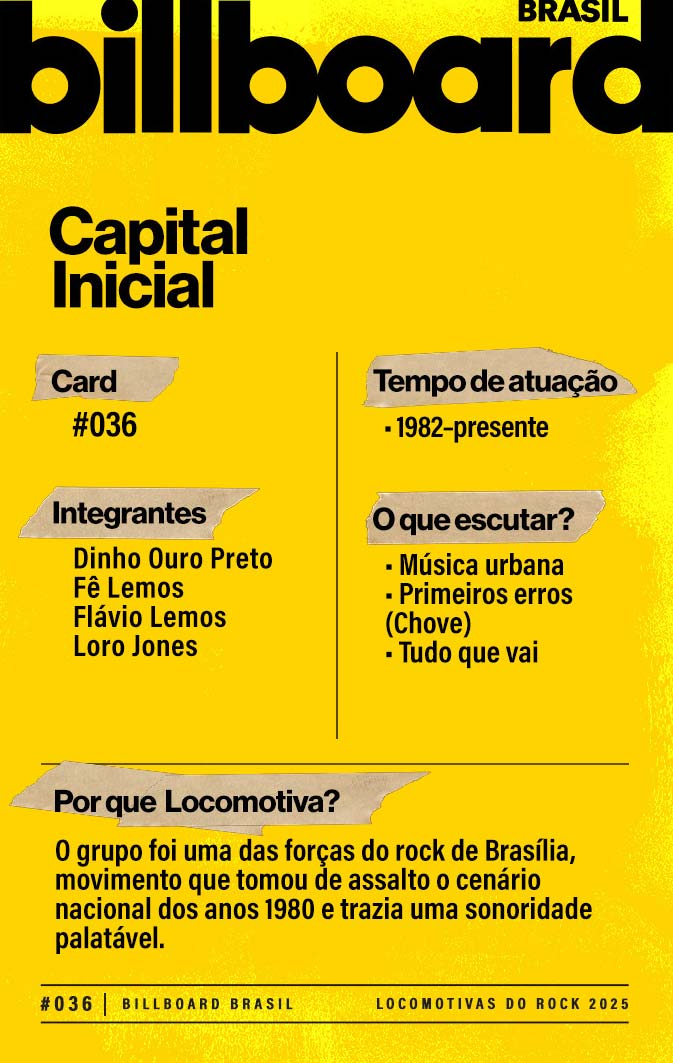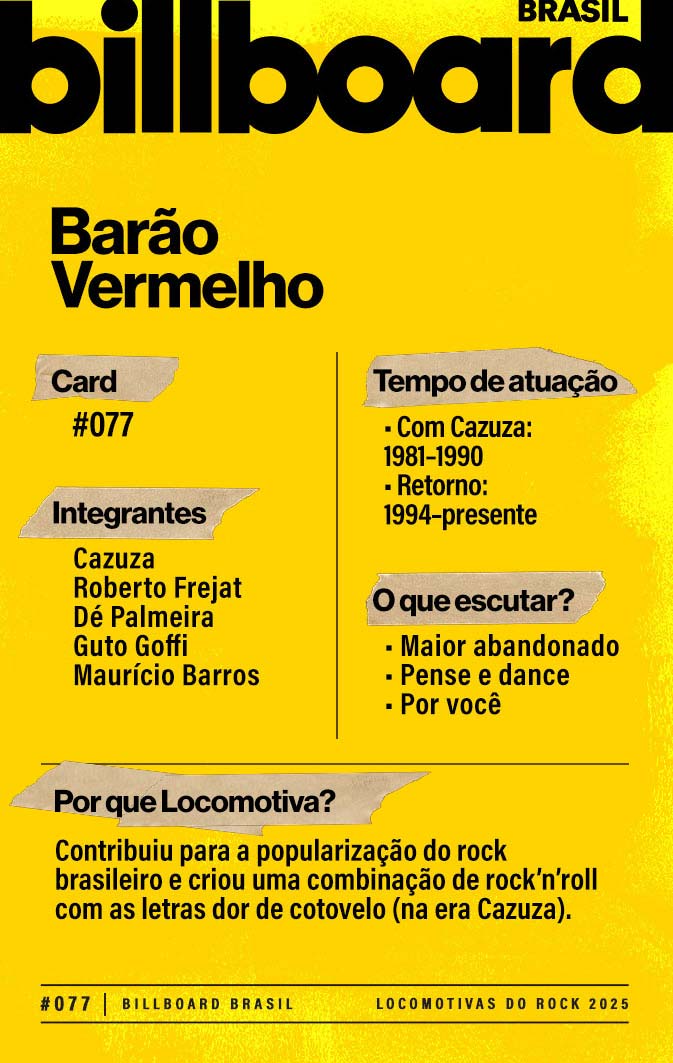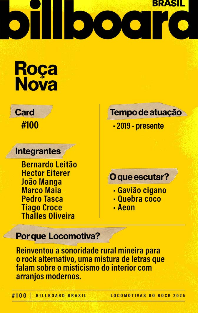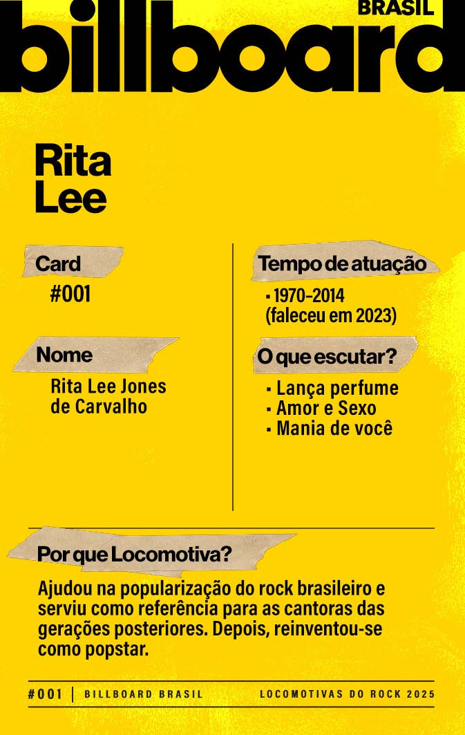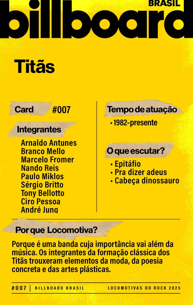 A lista a seguir celebra quem fez do rock nacional um motor cultural incansável, movido por visão, atitude e paixão. Billboard Brasil Locomotivas do Rock é um tributo a cem nomes que impulsionaram o gênero e tornaram sua trajetória impossível de frear.