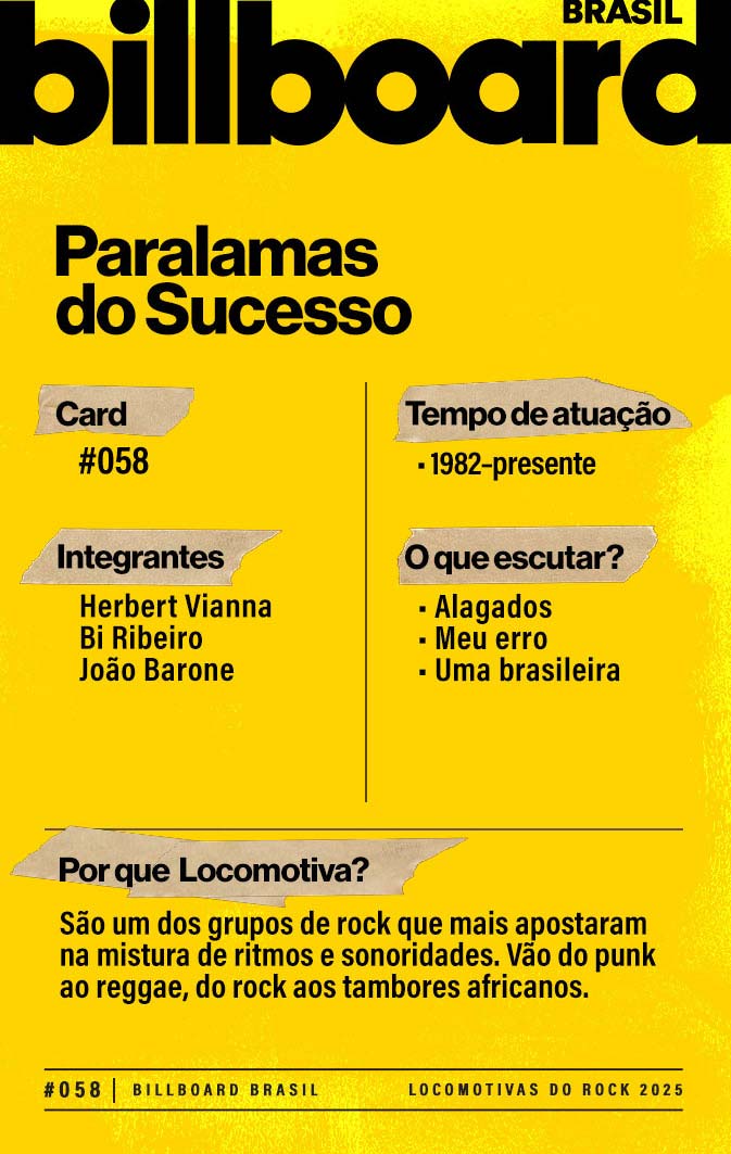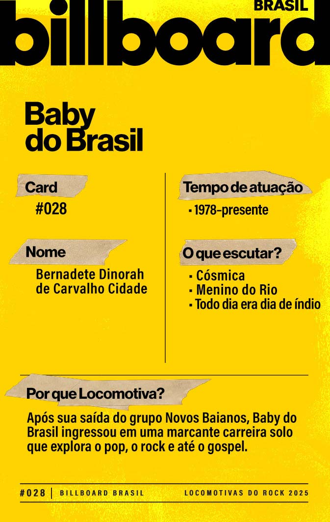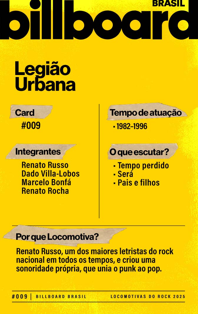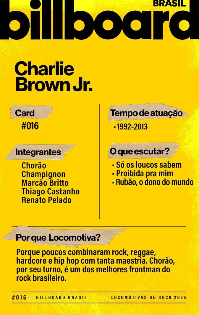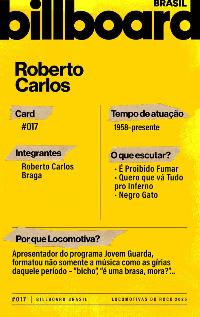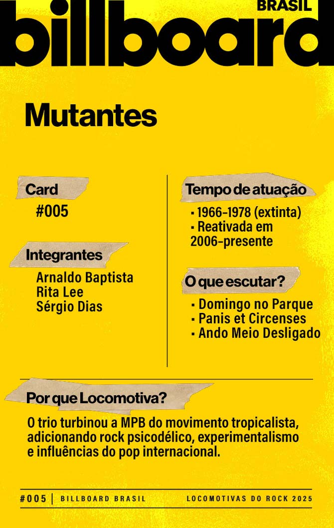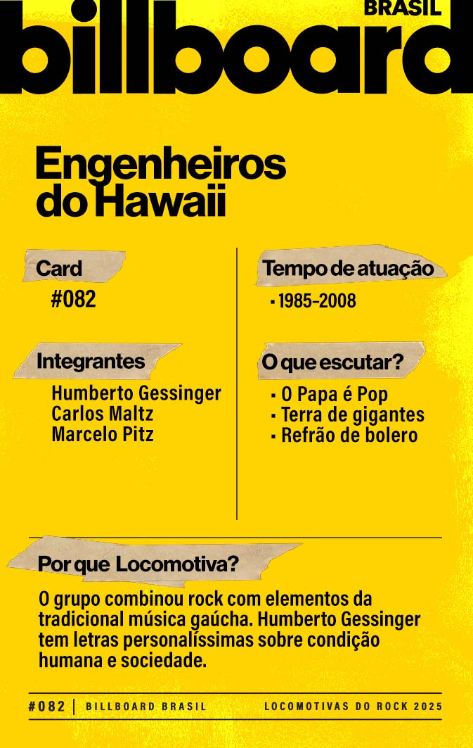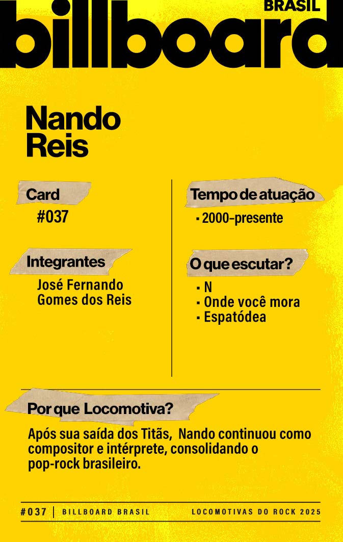 A lista a seguir celebra quem fez do rock nacional um motor cultural incansável, movido por visão, atitude e paixão. Billboard Brasil Locomotivas do Rock é um tributo a cem nomes que impulsionaram o gênero e tornaram sua trajetória impossível de frear.