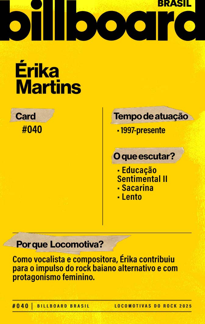 Baixe e CompartilheÉrika Martins é cantora, compositora e guitarrista brasileira. Começou na cena alternativa baiana e foi vocalista da banda Penélope (1997–2004), Entre 2015 e 2023 foi vocalista do grupo Autoramas, que tinha uma toada mais "surf-punk". Hoje segue carreira solo, apresentando seus próprios álbuns e participando como jurada em programas musicais na televisão.