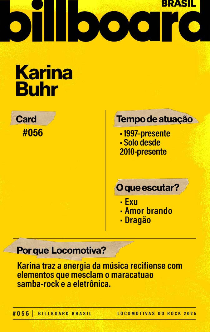 Baixe e CompartilheKarina Buhr é cantora, compositora e percussionista brasileira. Nascida em Salvador (1974) e criada no Recife, iniciou-se no maracatu (blocos Piaba de Ouro e Estrela Brilhante). foi integrante da banda "Eddie" e a "Comadre Fulozinha", mesclando rock com ritmos locais. Em carreira solo, lançou discos autorais premiados (como Eu Menti Pra Você e Longe de Onde Vem) que exploram desde samba-rock até música eletrônica.