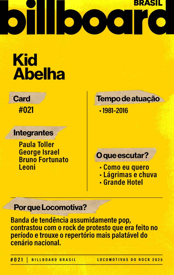 Baixe e CompartilheO estilo solar do Kid Abelha fez com que o grupo fosse chamado, jocosamente, de "rock de bermuda". Fofoca da oposição. Paula Toller (vocais), George Israel (saxofone) e Bruno Fortunato (guitarra) criaram um estilo particular de pop e Paula se revelou uma das grandes cantoras da geração.