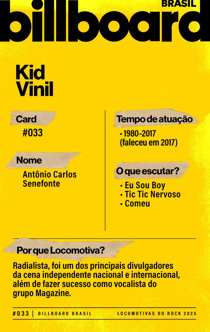 Baixe e CompartilheAntônio Carlos Senefonte ganhou o apelido de Kid Vinil de tão apaixonado que era por discos. No final de 1979, ele foi convidado para ser radialista e adotou o nome de guerra. Como vocalista do grupo Magazine (antes chamado de Verminose), popularizou a new wave no país.