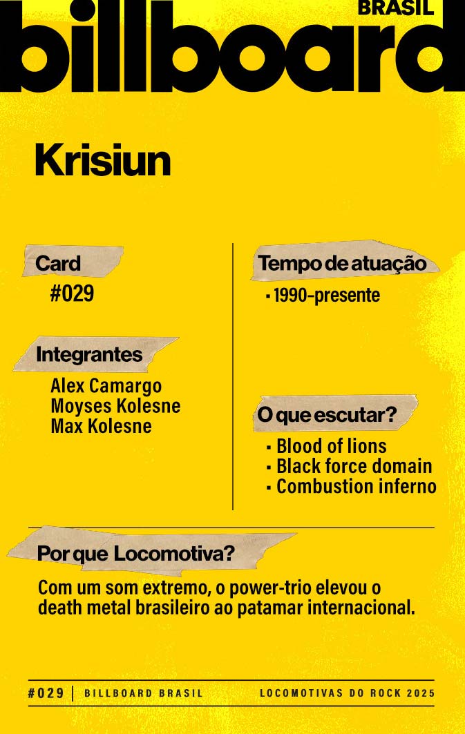 Baixe e CompartilheFormado em Porto Alegre em 1990 pelos irmãos Alex Camargo, Moyses Kolesne e Max Kolesne, o Krisiun ganhou destaque no underground com discos como Black Force Domain (1995) e Conquerors of Armageddon (2000). Conhecidos por suas apresentações intensas e pela velocidade extrema, deixando seu legado no metal extremo mundial.