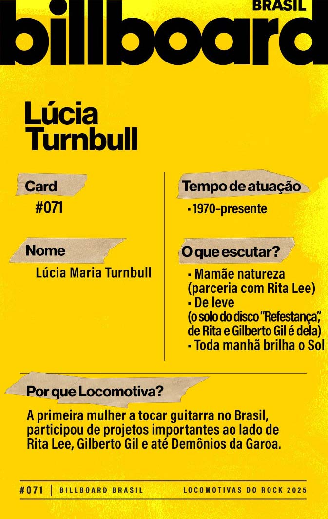 Baixe e CompartilheLúcia sempre amou música. Mas sua vida mudou quando foi morar em Londres, no final dos anos 1960. Ali, assistiu a shows de Caetano Veloso e Gilberto Gil, então, exilados, e montou uma banda folk. De volta ao Brasil, em 1972, trabalhou com Rita Lee e emprestou sua destreza nas seis cordas para diversos nomes do rock e da MPB.