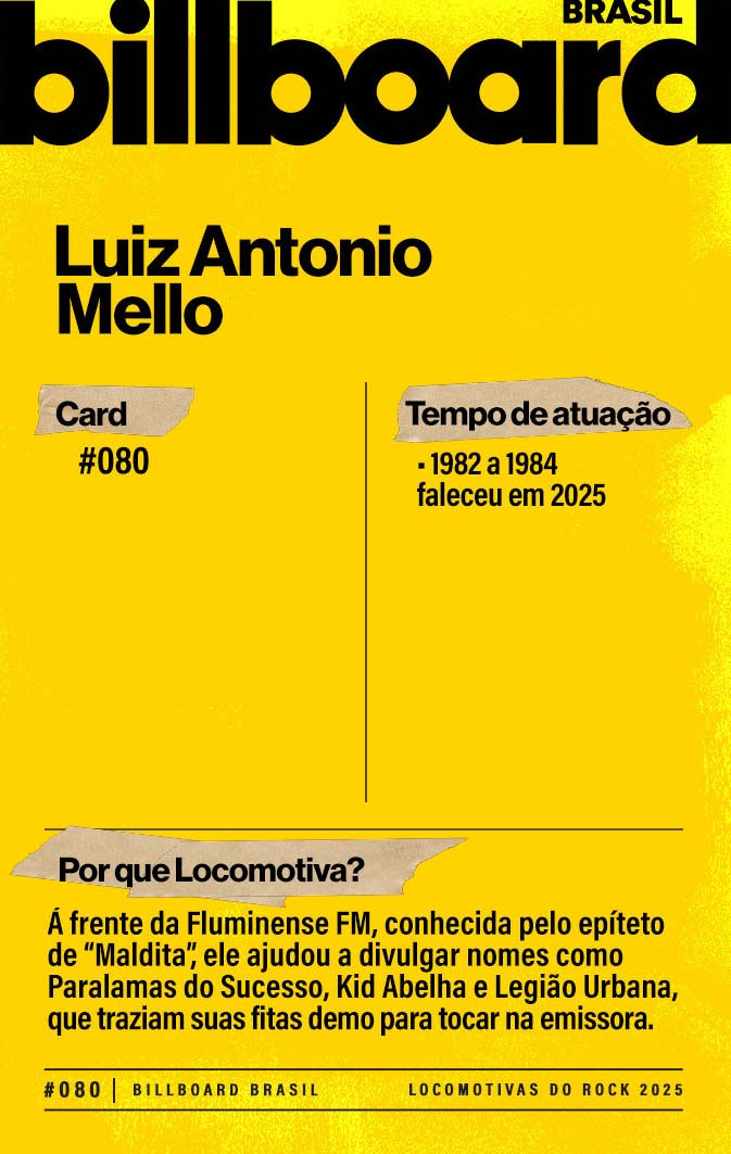 Baixe e CompartilheLuiz Antonio Mello começou em jornal, mas pouco tempo depois se bandeou para o mundo da rádio. Em março de 1982, ele colocou no ar seu projeto mais ambicioso: a Fluminense FM virou a "Maldita" e dedicou sua programação ao rock e às novidades do cenário nacional e internacional (que muitas vezes chegavam até em fitas demo). Luiz Antonio Mello morreu em abril de 2025.