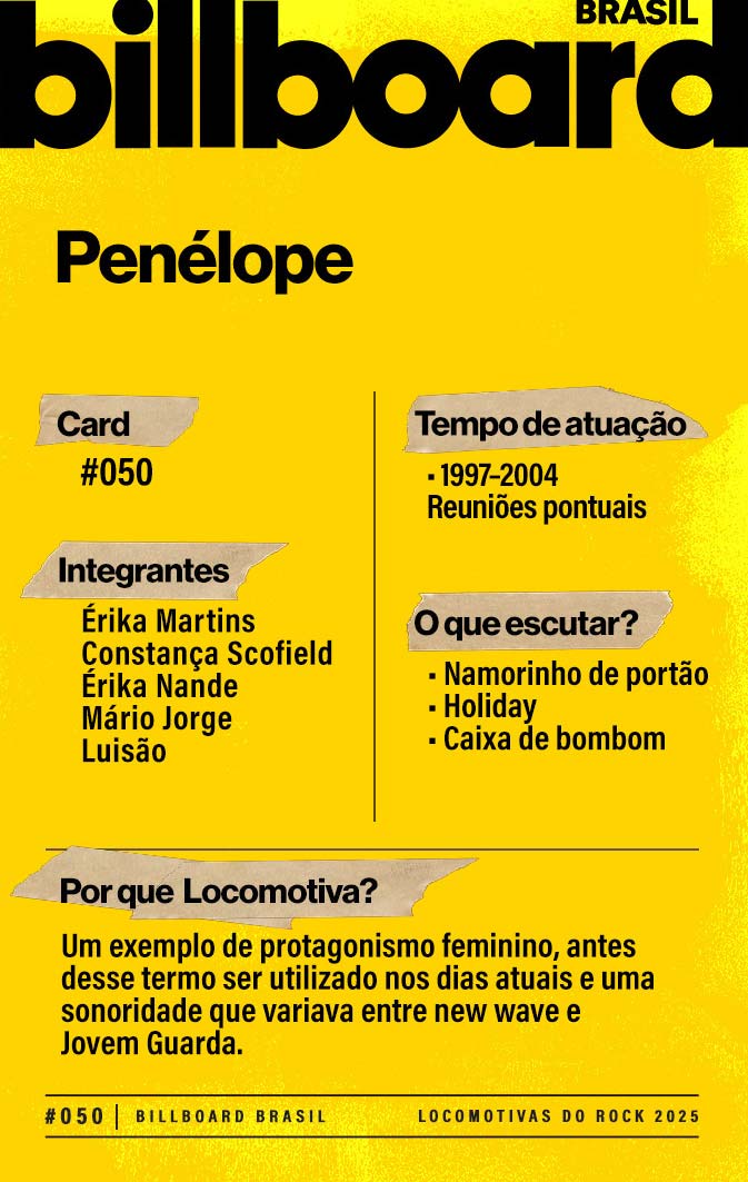 Baixe e CompartilheO Penélope surgiu quando a vocalista e guitarrista Érika Martins desejou criar uma banda essencialmente de mulheres – só tinha um homem, o guitarrista Luizão. Depois de uma apresentação consagradora no festival Abril pro Rock, de 1997, o grupo foi contratado pela gravadora Sony Music. Nos últimos tempos, renasceram para apresentações especiais.
