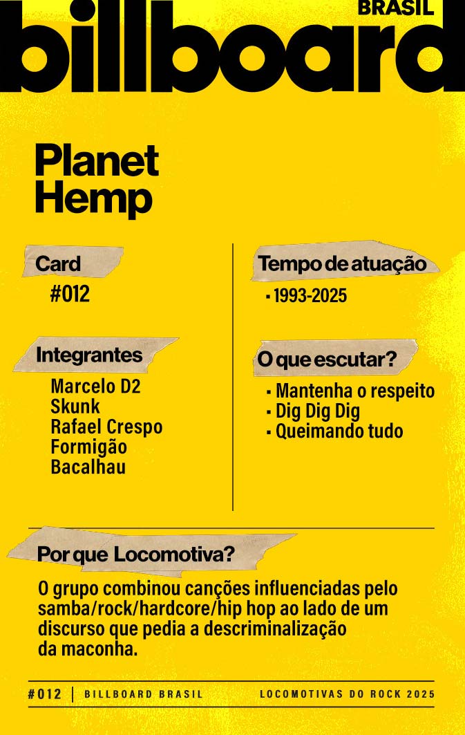 Baixe e CompartilheO Planet Hemp surgiu do encontro entre os vocalistas Marcelo D2 e Skunk (morto em 1994). Os outros integrantes vieram do universo do hardcore carioca. Com a morte de Skunk, BNegão assumiu os vocais – e por um breve período foi substituído pelo rapper Black Alien. Em 2025, eles anunciaram uma turnê de despedida.