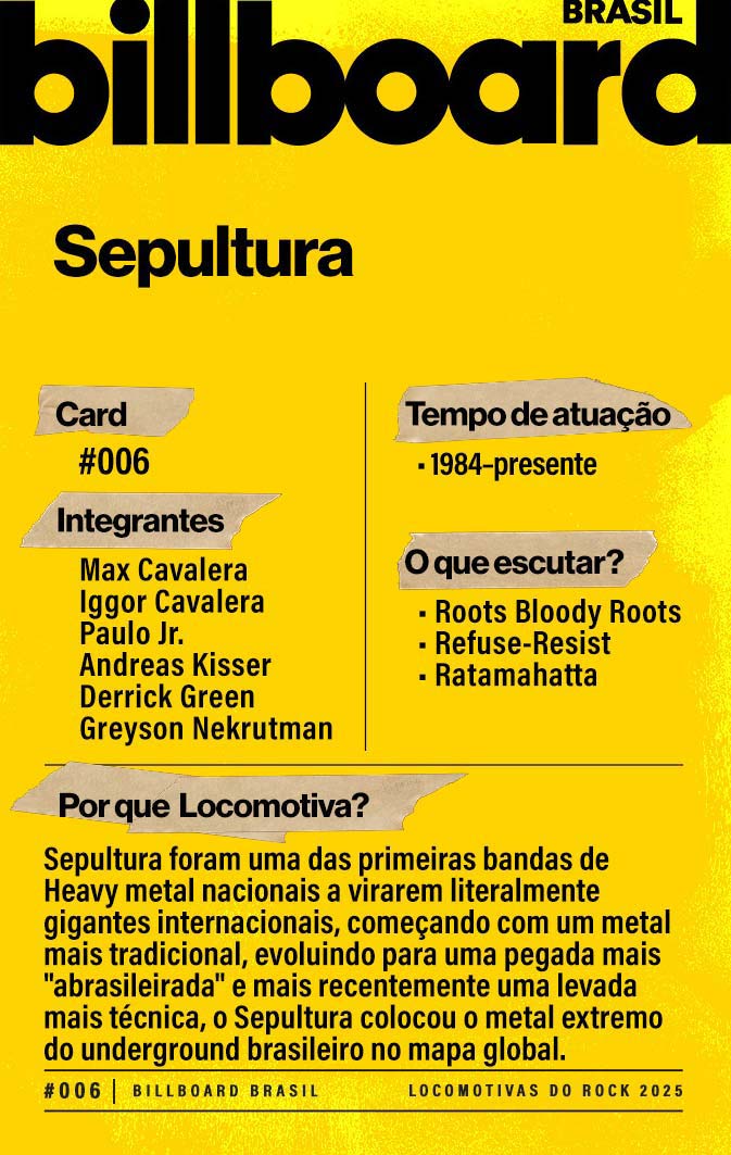 Baixe e CompartilheFormada pelos irmãos Max e Iggor Cavalera, o Sepultura começou uma banda de thrash e death metal, e virou uma referência mundial ao com os állbuns Chaos A.D. (1993) e Roots (1996), que misturavam percussão brasileira com a música pesada. Com a saída de Max em 1996 e, depois, de Iggor em 2006, Andreas Kisser manteve a banda viva ao lado do vocalista Derrick Green e do baixista Paulo Xisto. Em 2024, o Sepultura anunciou sua turê de despedida dos palcos: "Celebrating Life Through Death", prevista para encerrar em 2026.
