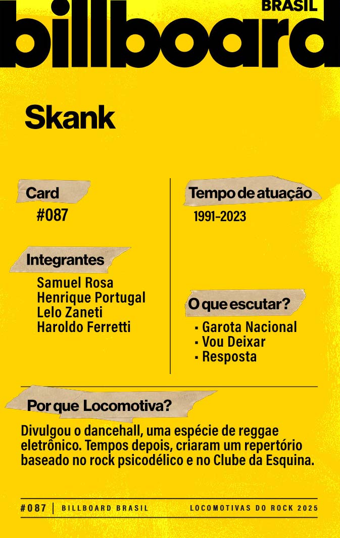 Baixe e CompartilheO nome já entrega a missão do grupo. Skank vem de "Easy Skanking", canção de Bob Marley. O quarteto mineiro lançou quatro discos de dancehall (um reggae mais eletrônico) que são referências do gênero. Inquietos, mudaram o jogo em "Maquinarama", de 2000, no qual trocaram o poder do baixo pela distorção das guitarras.