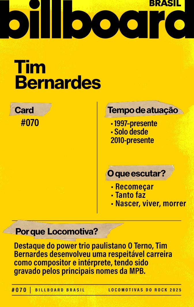 Baixe e CompartilheTim é filho de Maurício Pereira, cantor e compositor da dupla Os Mulheres Negras. Em 2009, criou o grupo O Terno, que trazia influências do rock dos anos 1960 e da música alternativa. Seu disco solo, “Recomeçar”, de 2017, trazia canções inspiradas na música folk. A qualidade de suas criações rendeu desde participação no disco do grupo americano de rock alternativo Fleet Foxes até canções gravadas por Gal Costa, Maria Bethânia e Tom Zé.