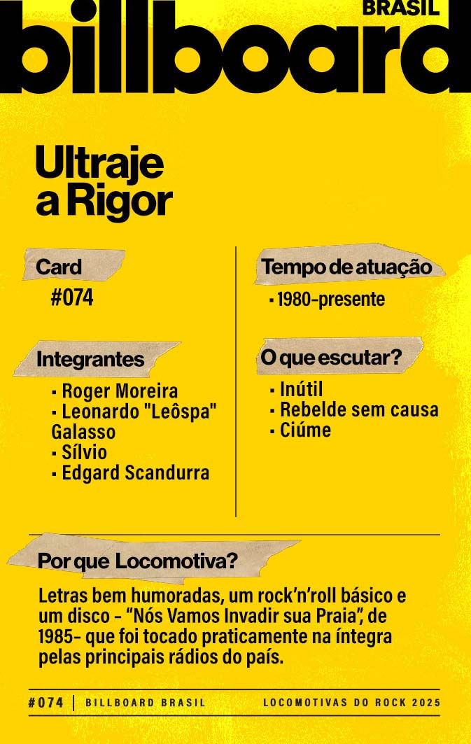 Baixe e CompartilheUltraje a Rigor nasceu como uma banda de covers, capitaneada pelo guitarrista e vocalista Roger Moreira. Em 1983, passou a investir em composições próprias e criou um dos hinos do Brasil dos tempos da ditadura – "Inútil". A combinação das letras certeiras de Roger e do rock que por vezes aceita influências da música caipira e do heavy metal são algumas das principais qualidades do grupo.