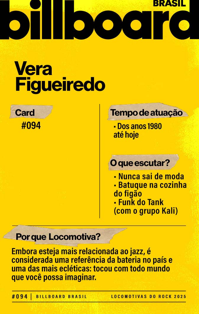 Baixe e CompartilheVera tinha oito anos quando iniciou seus estudos em bateria e piano (seus pais só aceitaram que ela socasse os tambores se estudasse harmonia no piano também). As influências de Vera vão desde o jazzista Gene Krupa ao roqueiro John Bonham. Ela divide seu tempo entre a carreira solo (tem três discos), o trabalho como instrumentista e de professora de bateria.